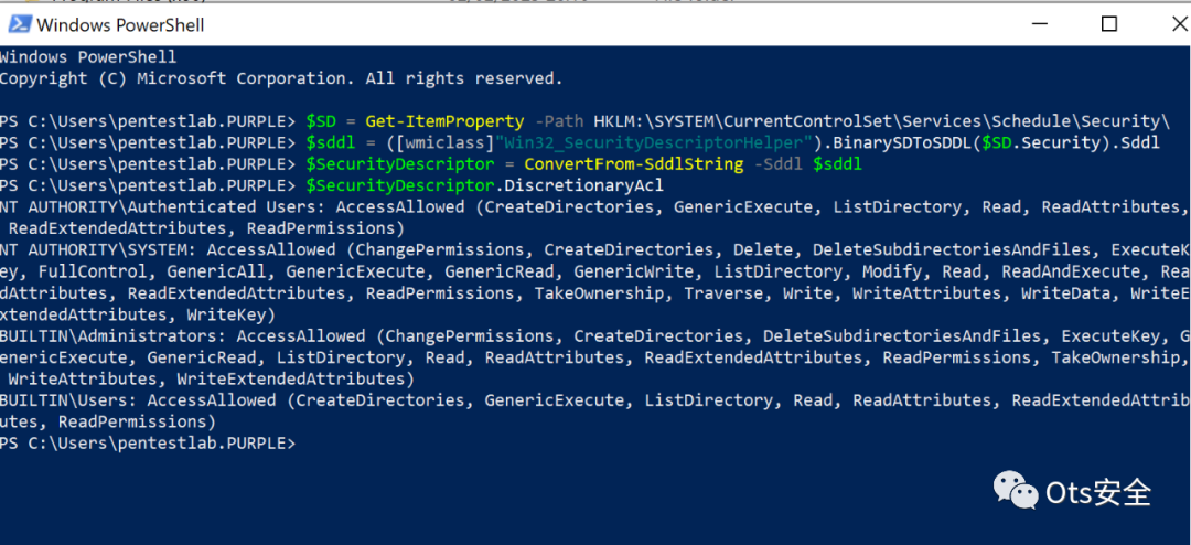 PowerShell 还可用于枚举所有用户组的 SDDL 权限并将其转换为可读格式。
