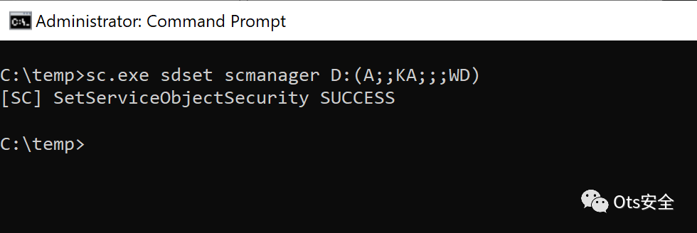 sc.exe sdset scmanager D:(A;;KA;;;WD)安全描述符权限修改