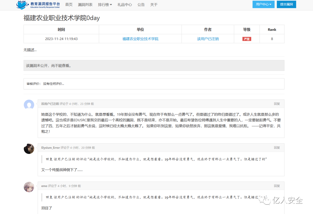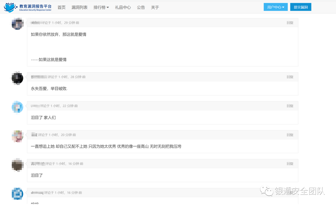 她是这个学校的,不知道为什么,就是想看看。19年那会没有勇气,现在终于有那么一点勇气了。但是错过了的终归是错过了。或许人生就是那么多的遗憾吧。这也或许是EDUSRC里我交的最后一个高校的漏洞,既不是结束,亦不是开始。最后希望各位师傅遇到人生中重要的人,一定要鼓起勇气。不要过了四、五年之后才鼓起勇气去说,这时候已经太晚太晚太晚了。如果你听到这里,如果你依然放弃,那这就是爱情,我难以抗拒。