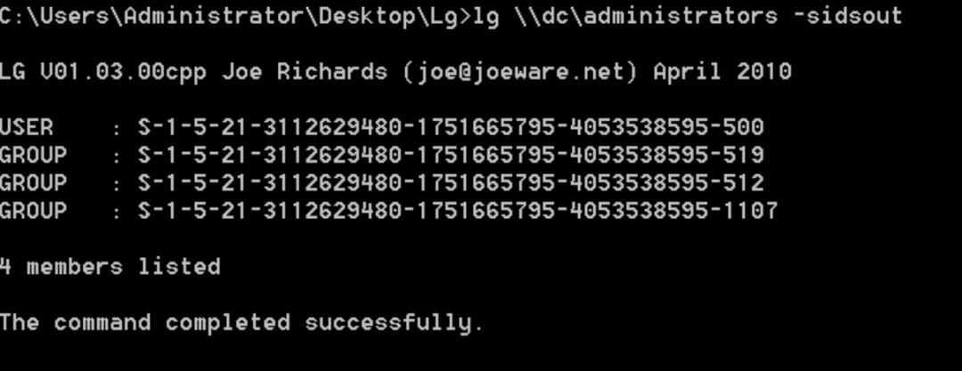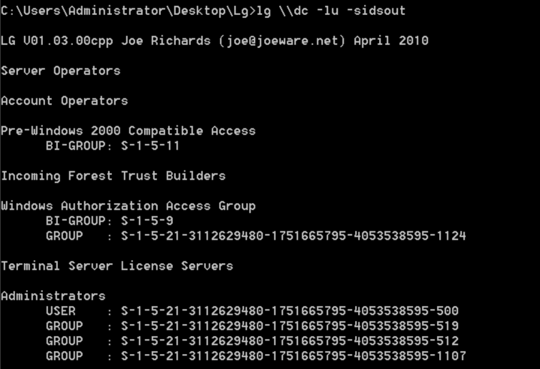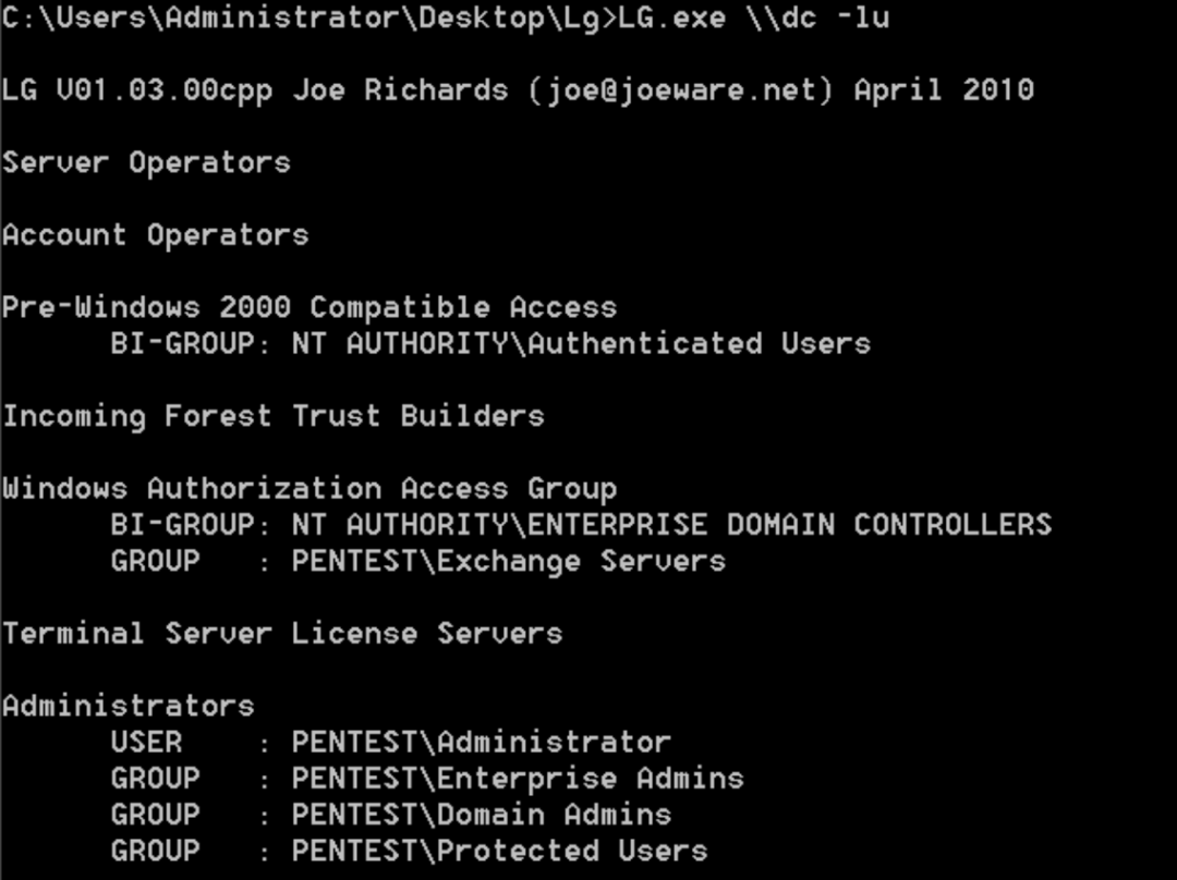 这里要利用到一个工具lg.exe,该工具是一款使用C++编写用于管理本地用户组和域本地用户组的命令行工具。使用lg.exe工具可以帮助我们枚举远程主机用户和组的信息。