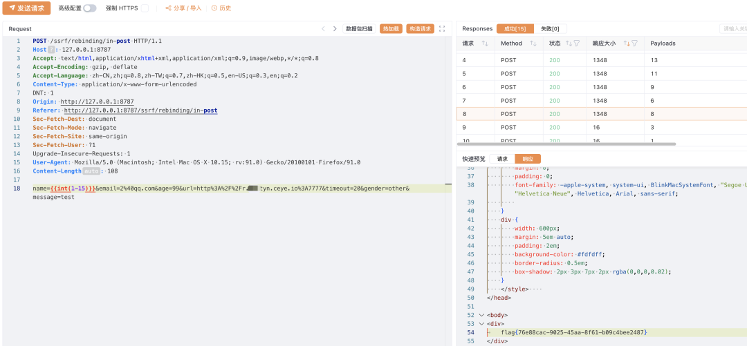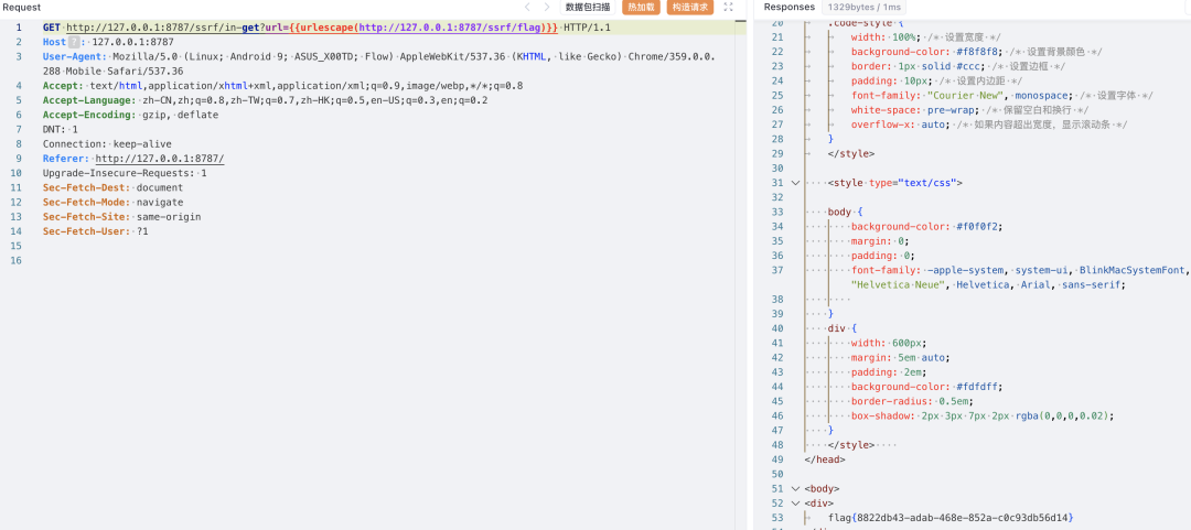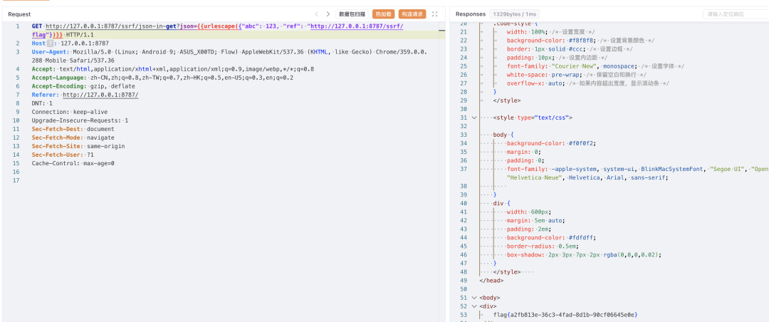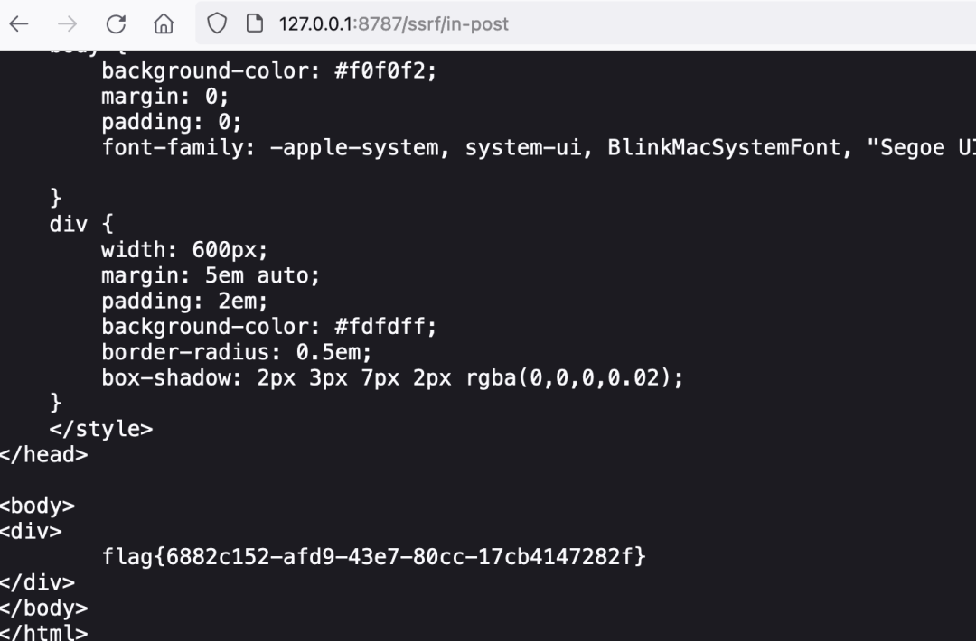 如果目标服务器存在SSRF漏洞,它将会发起对http://127.0.0.1:8787/ssrf/flag的GET请求。攻击者可以通过这种方式获取敏感信息、绕过防火墙,甚至攻击内部资源。