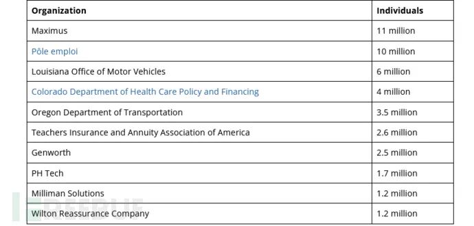 今年 8 月,网络安全公司 Emsisoft 分享了 Cl0p 勒索软件组织如何滥用 MOVEit Transfer 文件传输平台漏洞的具体细节。网络安全专家表示,此次攻击影响了约 1000 个组织和 60144069 名个人,Cl0p 勒索软件团伙利用零日漏洞 CVE-2023-34362 成功入侵了许多实体组织,并盗取大量数据信息。以下是受影响人数最多的组织名单: