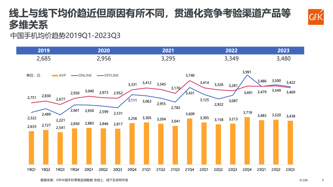 市场调研机构「GfK 中国」发布 2023 年第三季度市场报告。数据显示,今年中国手机市场整体销量预计为 2.7 亿台,与去年基本持平,2024 年将有一定回暖,但整体增幅不大。同时,各个渠道的表现也存在差异:线上市场销量相对较为稳定,线下销量有一定程度的下滑。报告指出,中国手机市场的均价在 2019 年仅为 2685 元,近几年开始持续增长,今年截至三季度均价已达 3480 元。不过,上升幅度逐渐放缓,主要原因在于高端手机占比的提升和超低端手机销量的下降。马云成立马家厨房公司