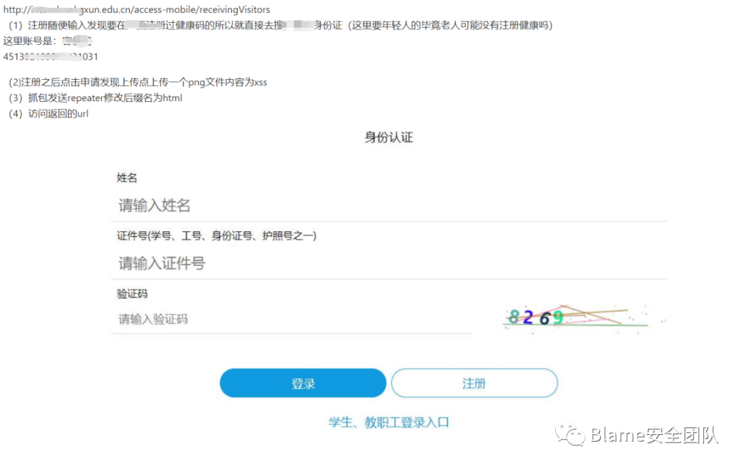 0x00 0x01这里注册选择搜索当地年轻人的证件号码注册进入之后,发现上传点我们进行抓包,这里我上传的png内容为xss的文件抓包修改后缀 0x02 漏洞21.先进行注册随便输入身份选取学院心理专
