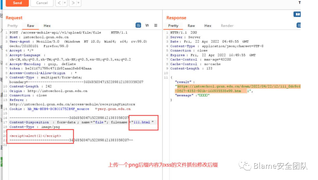 我们进行抓包,这里我上传的png内容为xss的文件抓包修改后缀