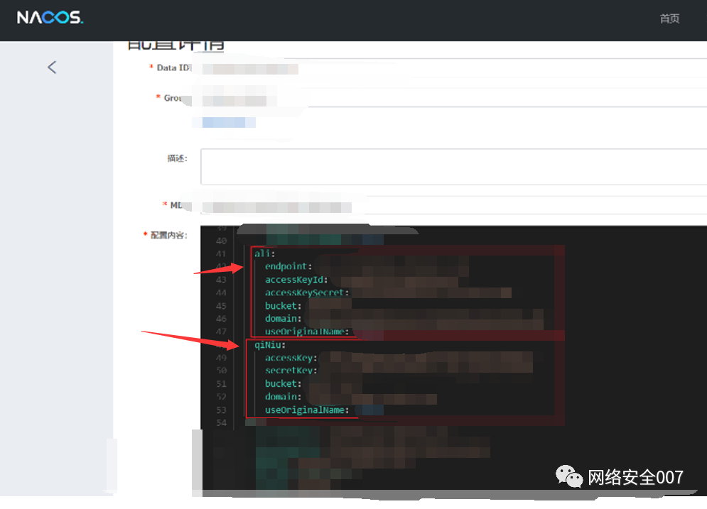 师傅们nacos应该很熟悉了,该次攻防中用路径低线程扫描可以获取到nacos路径,然后利用默认key硬编码漏洞获得管理权限,然后开始翻找各种配置文件,用配置文件的各种信息获得各种管理权限。