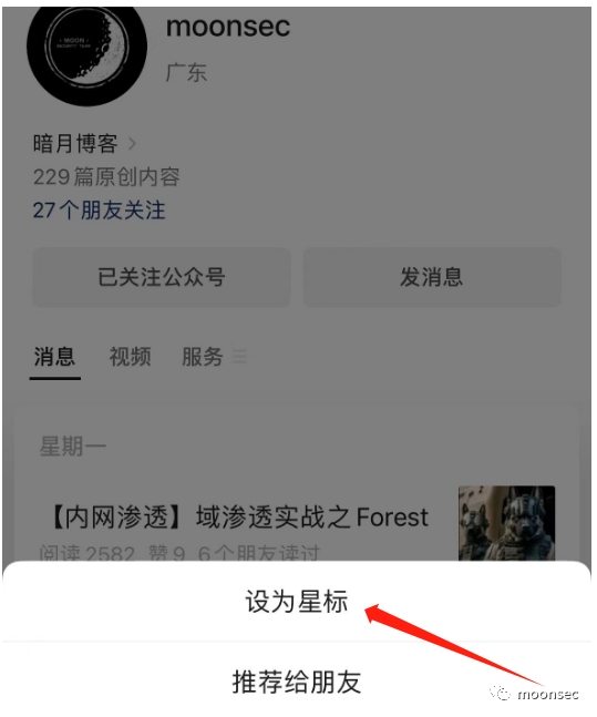 友们现在公众号推文机制变了,只对常读和星标的公众号才展示大图推送,建议大家能把【moonsec】“设为星标”哦,否则可能就看不到了啦