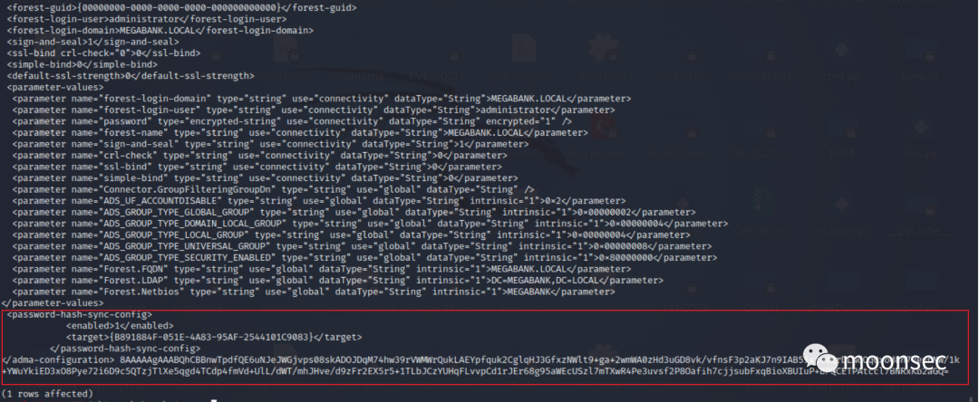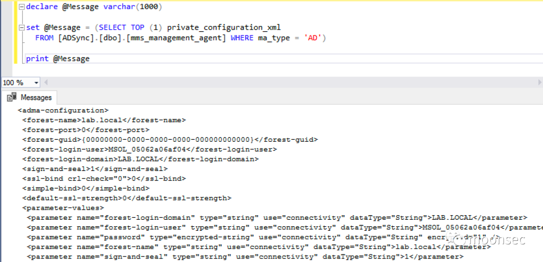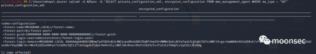 数据库通过存储服务的元数据和配置数据来支持 Azure AD 同步服务。搜索我们可以看到一个名为的表mms_management_agent,其中包含许多字段,其中包括private_configuration_xml. 该字段中的 XML 包含有关MSOL用户的详细信息: