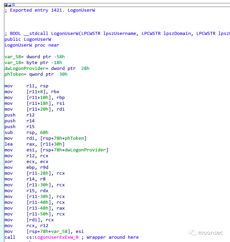 在添加钩子之前,我们需要了解一下如何LogonUserW工作,以确保在执行代码后可以将调用恢复到稳定状态。在 IDA 中查看advapi32.dll,我们发现它LogonUser实际上只是一个包装器LogonUserExExW: