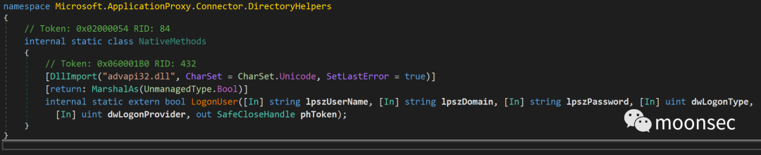 当我们开始进一步挖掘时,我们发现这些方法实际上LogonUserW通过 pinvoke 包装了 Win32 API:
