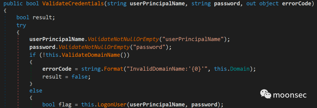 正如我们在上面看到的,虽然大部分逻辑发生在 .NET 中,但用于验证从 Azure AD 传递的凭据的实际身份验证调用是使用非托管 Win32 API 进行的LogonUserW。这为我们提供了一个很好的地方来注入一些代码并将调用重定向到我们控制的函数中。