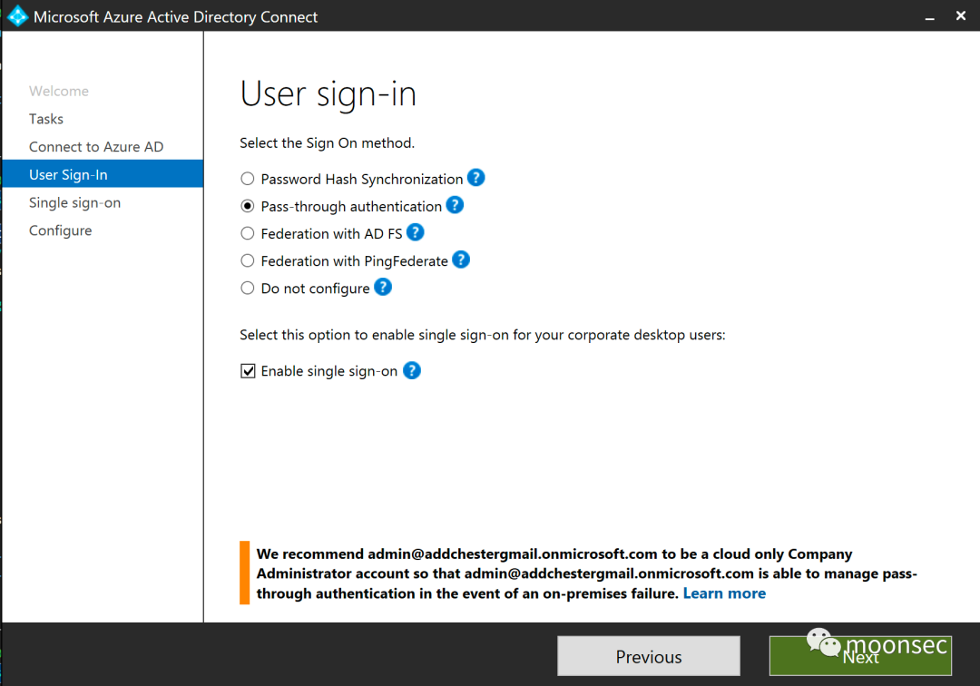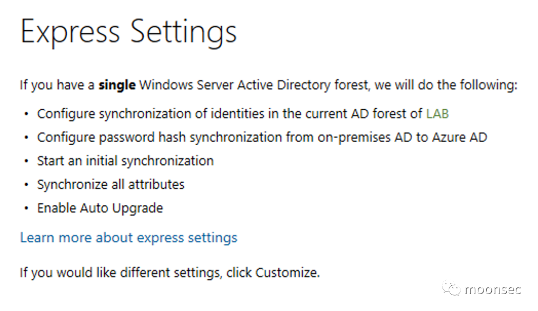 为了加快实验室中的安装过程,我们将在 Azure AD Connect 安装过程中使用“快速设置”选项,该选项默认为密码哈希同步: