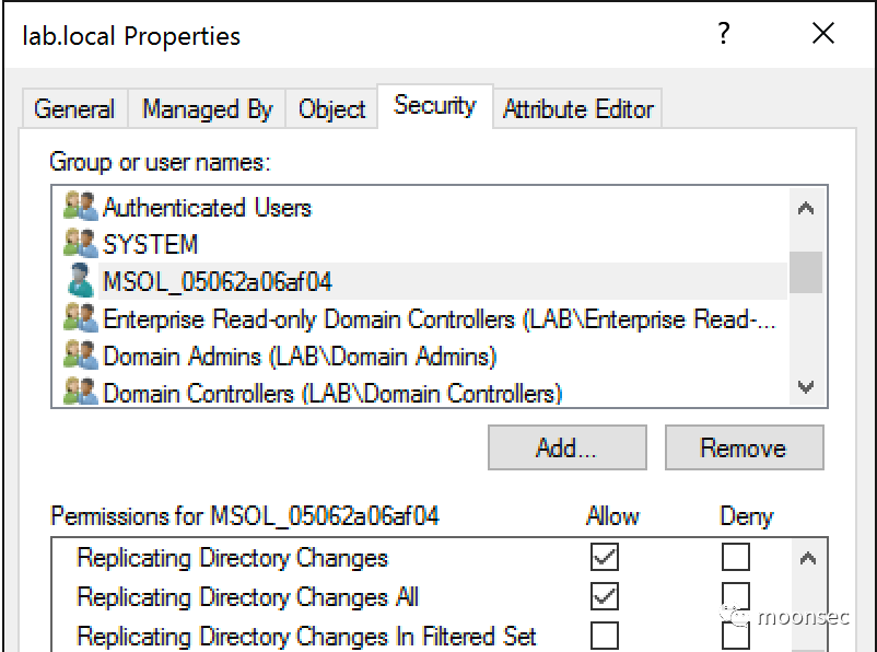 因此,我们在这里实际看到的是 Azure AD Connect 如何从 Active Directory 检索数据并将其转发到 Azure AD。那么这对我们意味着什么呢?众所周知,要通过 Mimikatz 执行 DCSync,帐户必须拥有 AD 中的“复制目录更改”权限。回顾一下 Active Directory,我们可以看到在安装 Azure AD Connect 期间创建了一个新用户,用户名为MSOL_[HEX]。快速检查其权限后,我们看到了我们对负责复制 AD 的帐户的期望:
