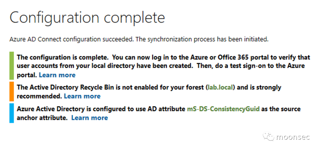 Azure AD Connect 安装完成后,您应该收到如下通知: