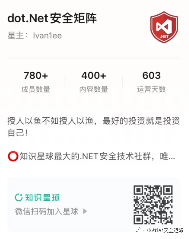 dot.Net安全矩阵是唯一被星球官方推荐过的.NET领域安全技术星球,星球运营已满600天,沉淀精华主题400+,近800+成员一起互动学习,这里汇集了众多来自各行各业的安全攻防技术大神,他们不仅具有丰富的.NET代码审计、渗透测试、漏洞分析等领域实战经验,并且愿意将这些宝贵的经验交流分享给更多的人。