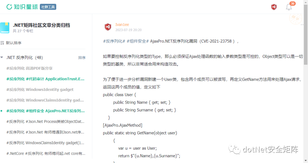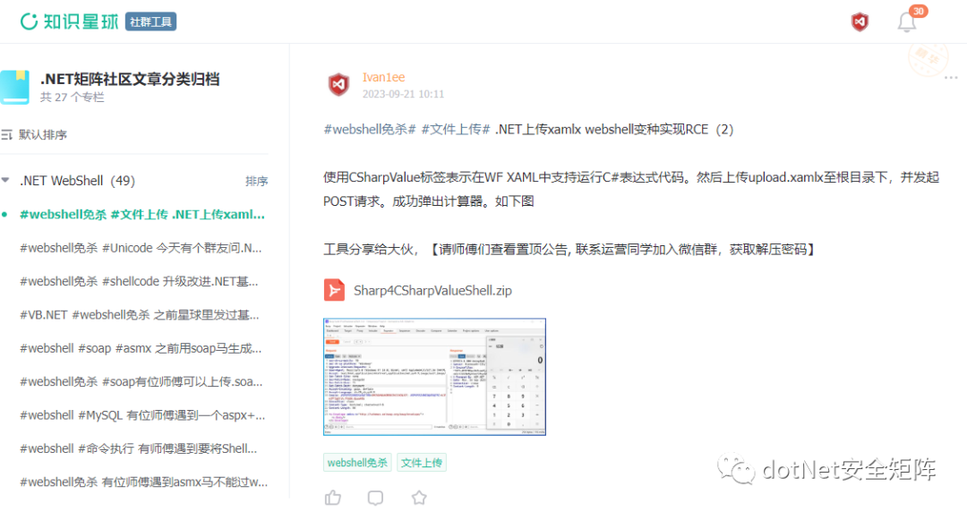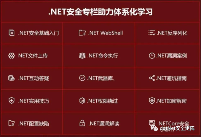 dot.Net安全矩阵星球在内容上共计27个专栏,覆盖了.Net Tricks、漏洞分析、内存马、代码审计、预编译、反序列化、webshell免杀、命令执行、渗透武器库等,所有的知识都是经过精心挑选和制作的,确保您可以从中得到高质量的信息和收获。