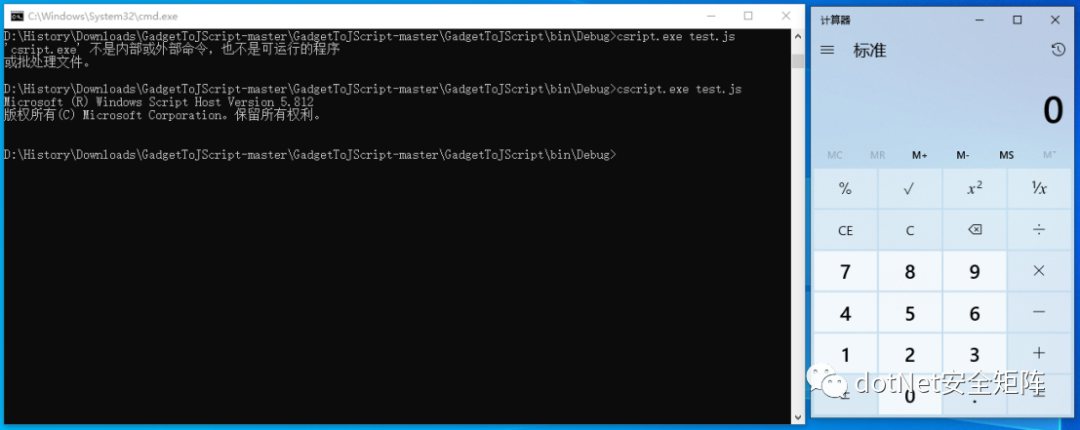 打开cmd运行命令:GadgetToJScript.exe -w js -o test -i Program.cs,GadgetToJScript 将会将Program.cs编译后嵌入到test.js文件中,从而创建一个用于触发.NET程序集加载的js脚本文件,最后实战中使用cscript.exe test.js命令触发执行,如下图所示