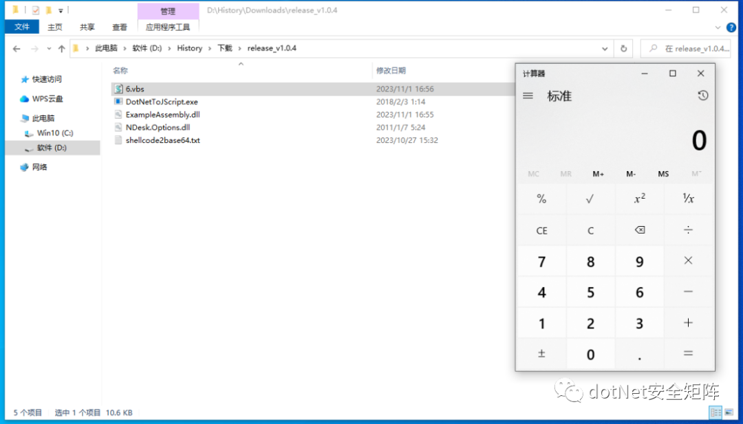 运行命令:DotNetToJScript.exe -l vbscript -o 6.vbs ExampleAssembly.dll,生成一个vbs脚本文件6.vbs,默认双击打开或者执行命令cscript 6.vbs,如下图所示