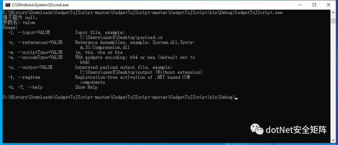下载项目到本地后首先需要移除测试的TestPayload项目,因为缺少默认的文件导致编译项目失败,编译获得GadgetToJScript.exe,直接运行可看到详细的使用说明,如下图所示