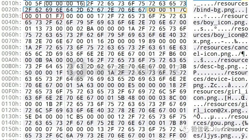 首先为4字节,为包内文件的数量,如“00 00 00 5F”代表一共有95个文件,然后是包内文件各自的信息,例:“00 00 00 16”代表文件名称的长度为22个字节,“2F 72 65 6F...... 2E 70 6E 67”为带存放路径的文件名称,“00 00 11 7C”对应文件在小程序包中的具体偏移位置,“00 01 01 F7“对应文件在小程序包中的数据长度。