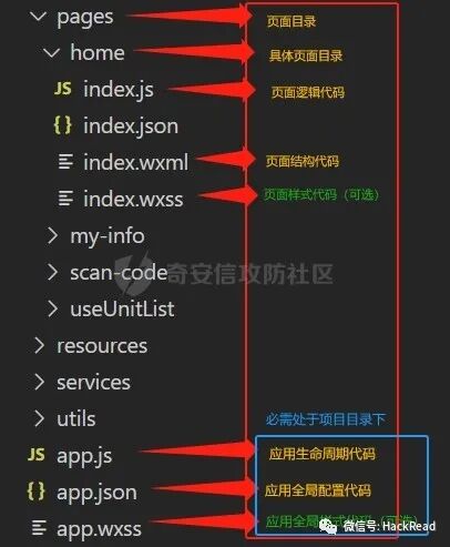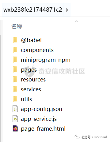 但这并不是最初的原项目文件结构,原因是微信服务器会将小程序源码中所有的“js”文件压入“app-service.js”文件中,将所有的“json”文件压入“app-config.json”中,将所有的“wxml”文件压入“page-frame.html”文件中,“wxss”则在处理之后以“html”文件的形式存留在对应页面目录之下。