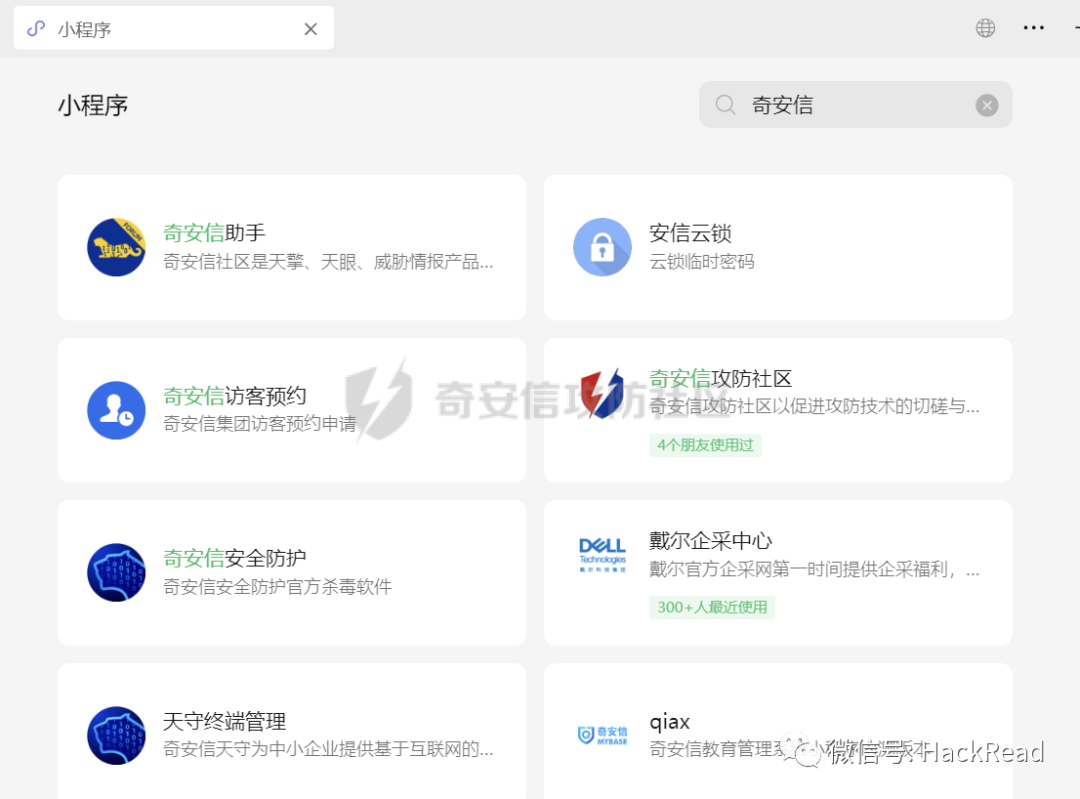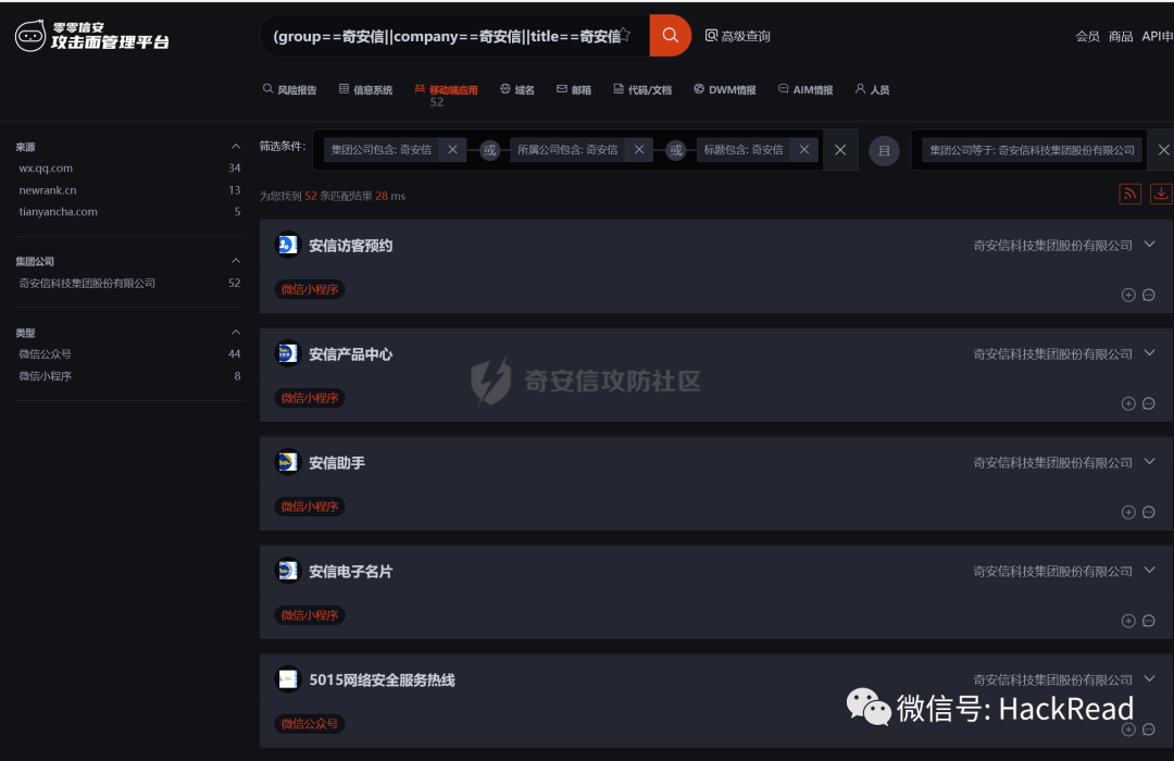 笔者常用的搜索方式为使用微信官方小程序界面的搜索功能与北京零零信安科技有限公司的 0.zone平台,后者可以全自动采集目标企业APP(APK)列表、下载地址和其详情介绍等信息,半自动进行小程序、公众号、生活号等的列表、名称和地址采集。较官方搜索功能,可以更精确的检索目标。
