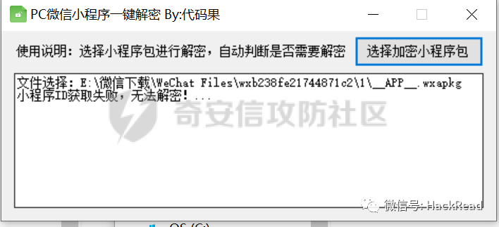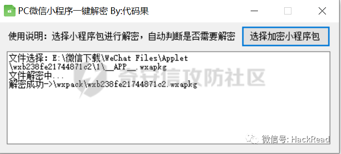 这里使用的解密工具为代码果所编写UnpackMiniApp.exe,用法为点击“选择加密小程序包”,选中待解密的__APP__.wxapkg,将会在UnpackMiniApp.exe当前目录的wxpack文件夹中生成解密后的文件。