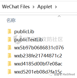 在WeChat Files目录下有一个名为Applet的文件夹,以“wx”开头的文件夹即为小程序文件夹。如果之前打开了很多微信小程序,那么目录中就会存在多个小程序文件夹。第一种区分方法是按照修改时间来进行区分。第二种方法是在微信页面中删除所有浏览过的小程序,重新打开需要进行测试的小程序,那么目录中只会存在一个小程序文件夹。