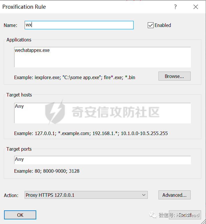 添加规则:程序“wechatappex.exe”,动作为刚才设置的代理服务器