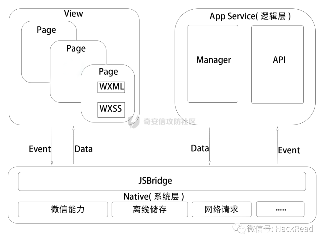 整个小程序框架系统分为两部分:逻辑层(App Service)和 视图层(View)。小程序提供了自己的视图层描述语言 WXML 和 WXSS,以及基于 JavaScript 的逻辑层框架,并在视图层与逻辑层间提供了数据传输和事件系统,让开发者能够专注于数据与逻辑。
