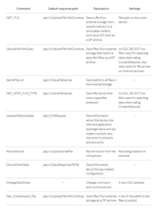 在设备信息成功上传后,恶意软件开始以预先配置的间隔(默认为一分钟)向C&C询问指令,开发人员称之为“命令”。下表包含恶意软件用于向服务器发送响应的命令和路径的详细描述: