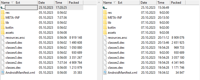 受攻击应用程序中的DEX时间戳(左)和未攻击版本中的DEX时间戳(右)