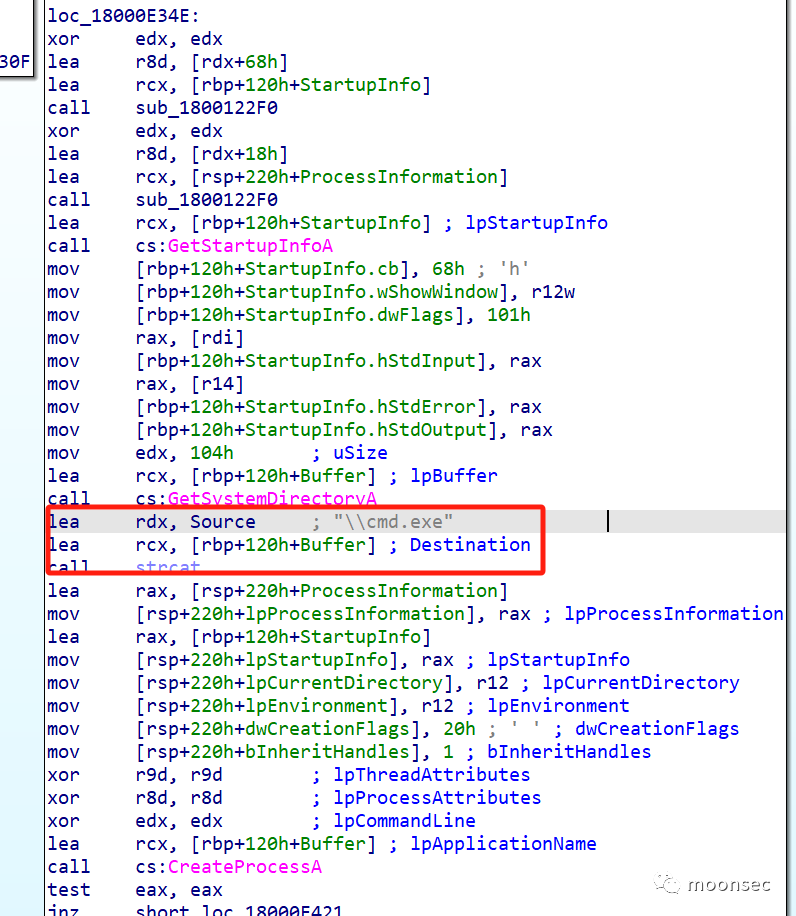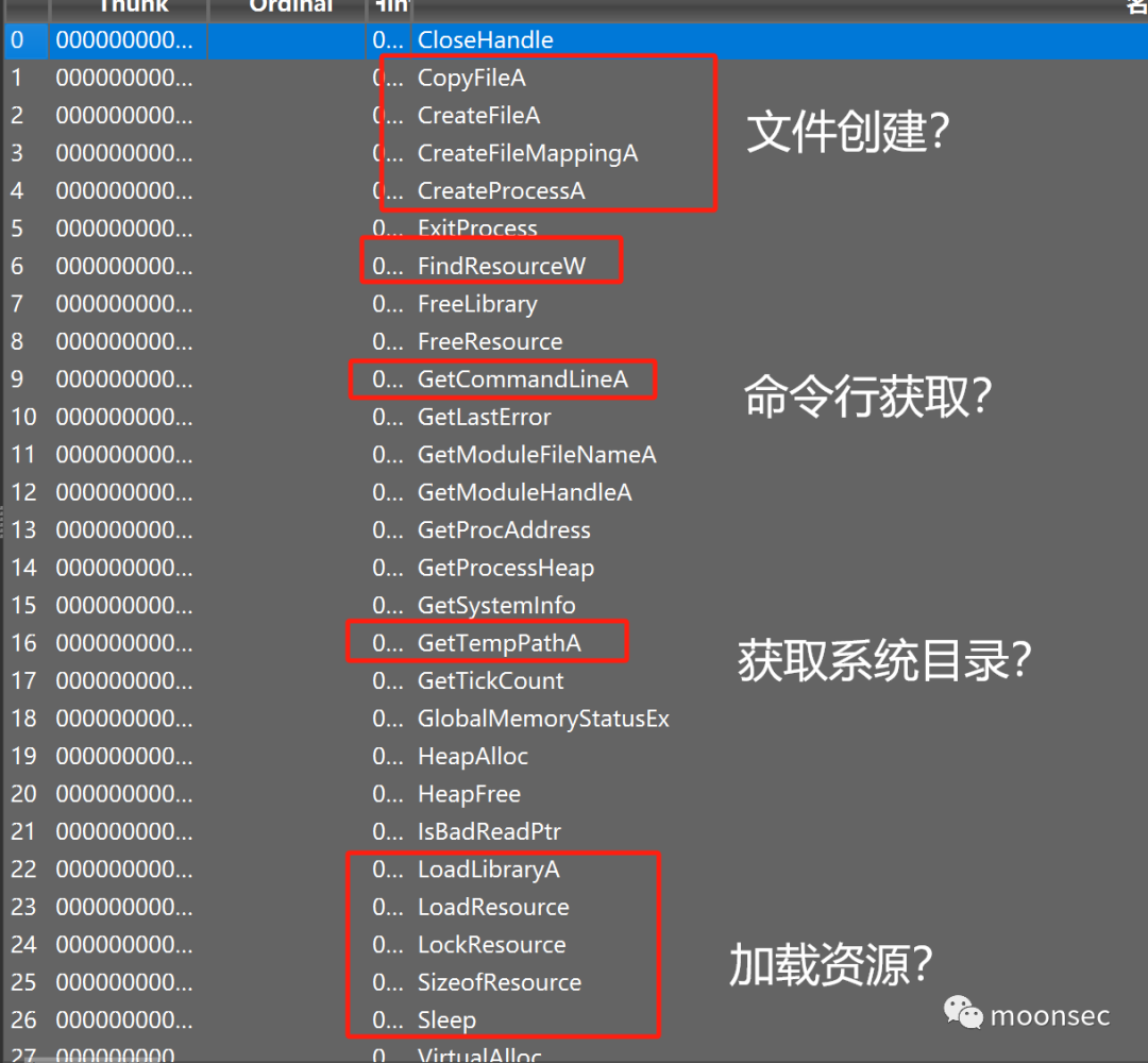 通过几个常见的函数可以猜测,这个程序可能要创建文件在系统目录,资源至于加载什么,命令行获取什么,可以先暂且记一下。