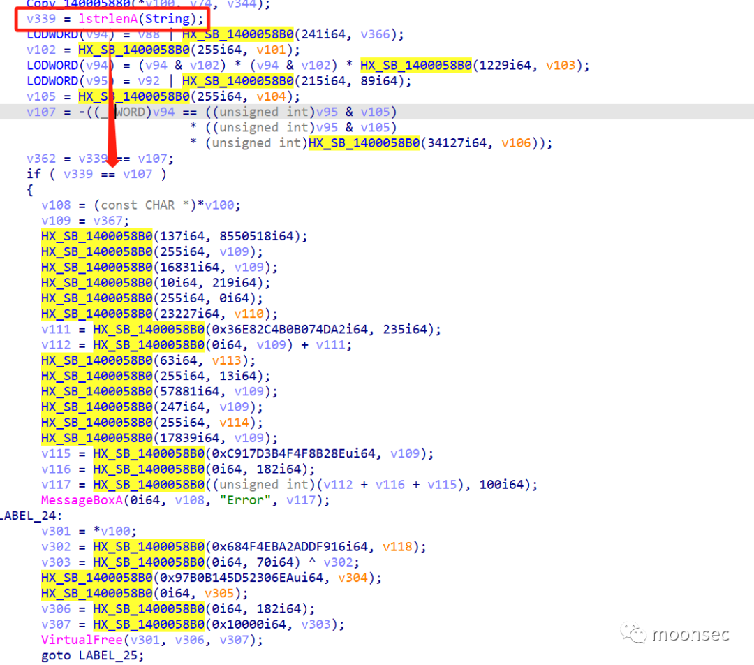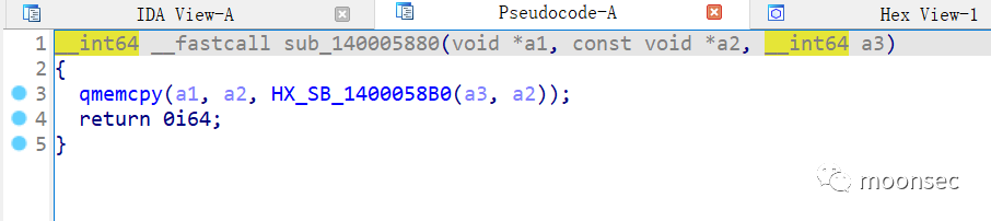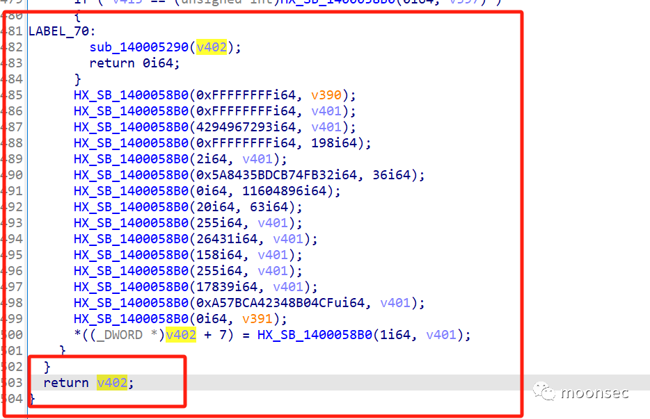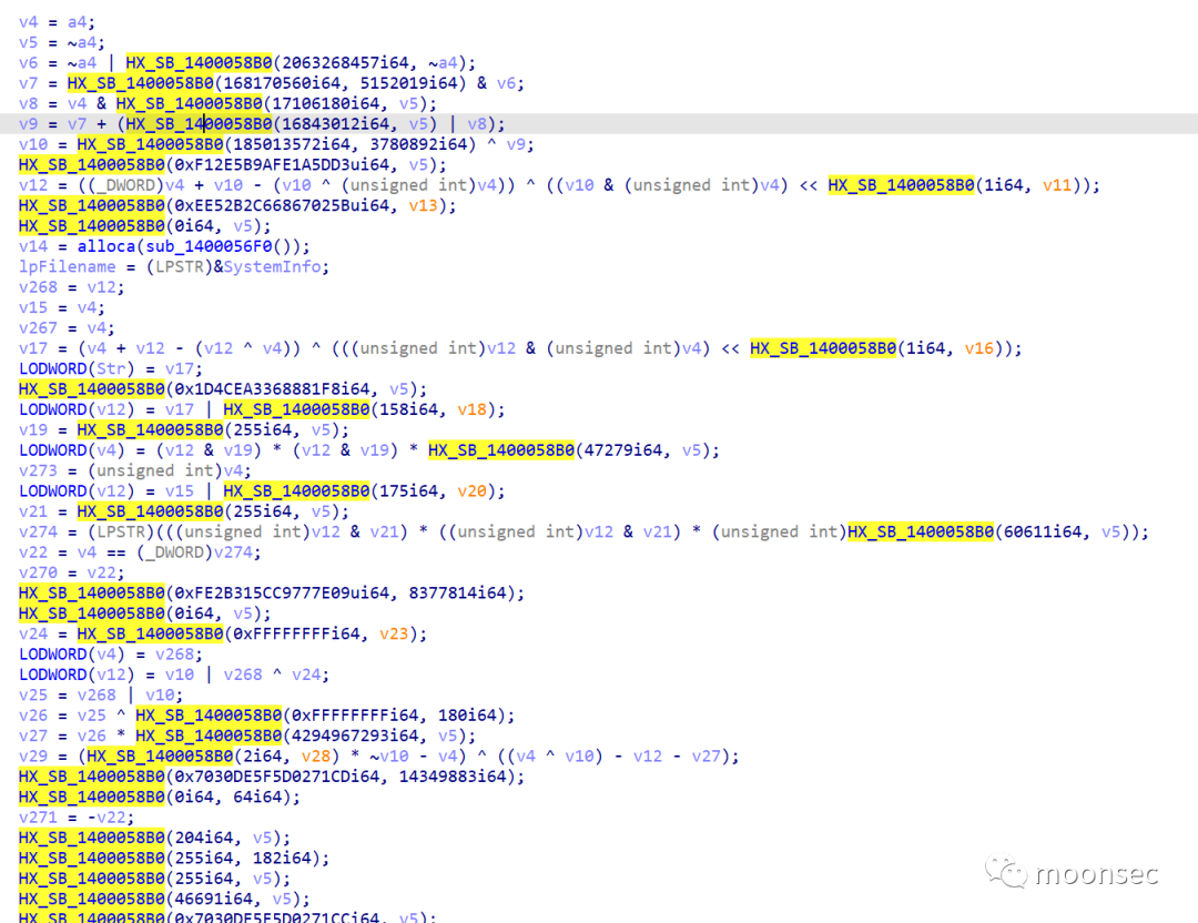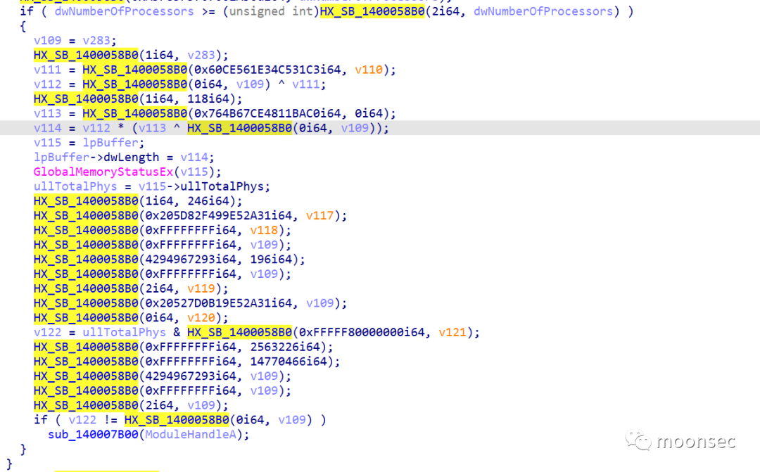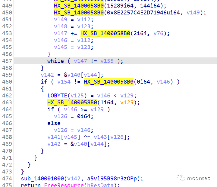 F5来到伪代码查看,黄色标记便是他的混淆了,已经改了名字方便接下来分析了