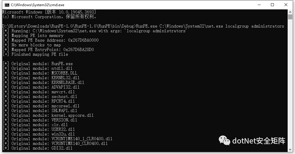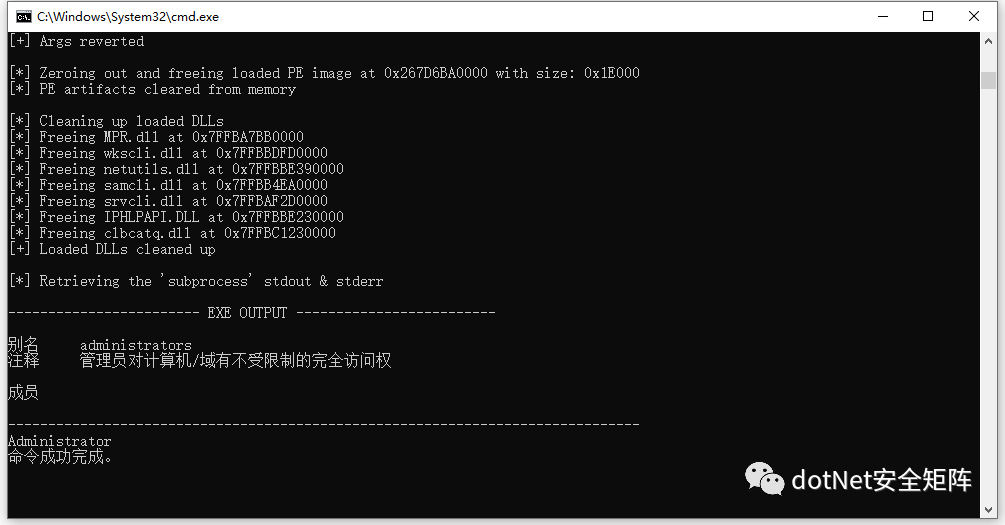 RunPE成功执行net.exe localgroup administrators 输出管理员组成员列表,如下图所示