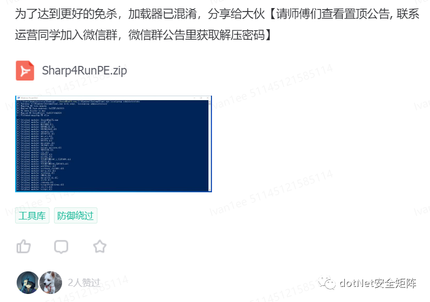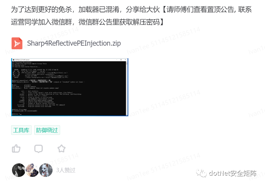 星球汇聚了各行业安全攻防技术大咖,并且每日分享.NET安全技术干货以及交流解答各类技术等问题,社区中发布很多高质量的.NET安全资源,可以说市面上很少见,都是干货。其中主题包括.NET Tricks、漏洞分析、内存马、代码审计、预编译、反序列化、webshell免杀、命令执行、C#工具库等等,后续还会倾力打造专刊、视频等配套学习资源,循序渐进的方式引导加深安全攻防技术提高以及岗位内推等等服务。