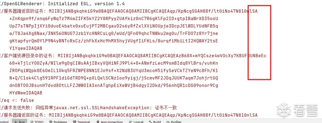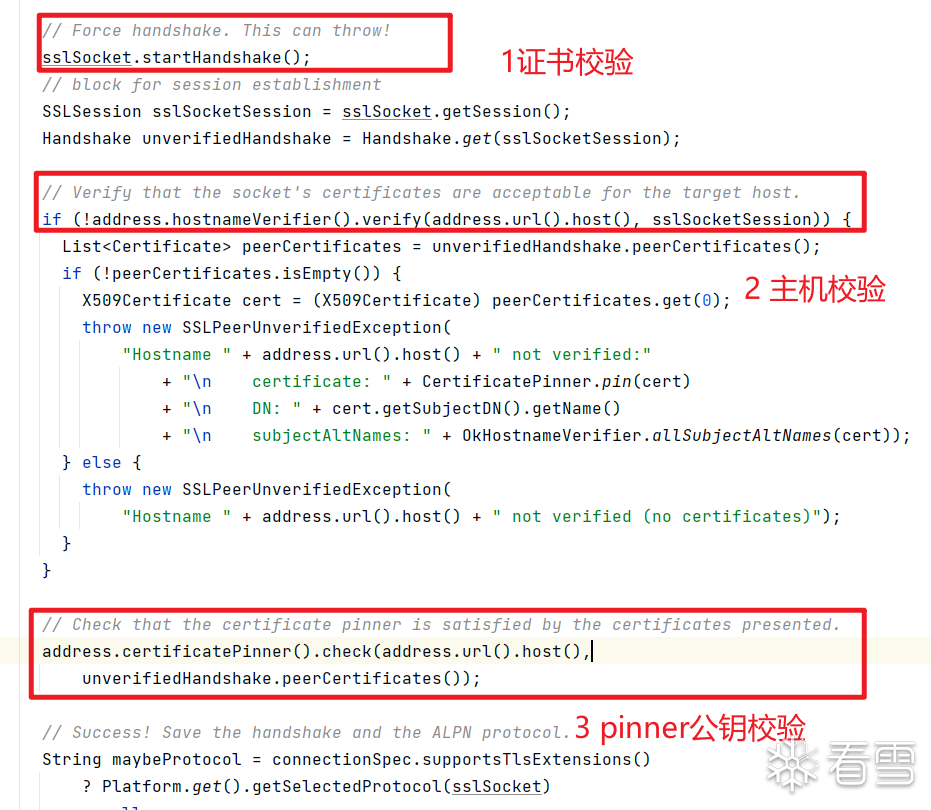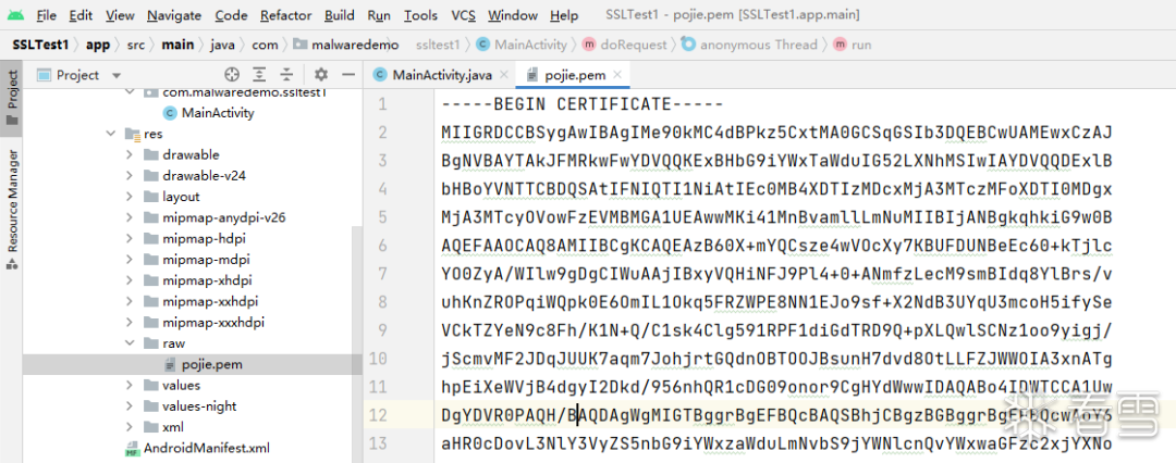 private void doRequest2(){X509TrustManager trustManager = new X509TrustManager() {@Overridepublic void checkClientTrusted(X509Certificate[] chain, String authType) throws CertificateException {}@Overridepublic void checkServerTrusted(X509Certificate[] chain, String authType) throws CertificateException {//服务器返回的证书X509Certificate cf = chain[0];//转换为RSA的公钥RSAPublicKey rsaPublicKey = (RSAPublicKey) cf.getPublicKey();//Base64 encodeString ServerPubkey = Base64.encodeToString(rsaPublicKey.getEncoded(), 0);Log.e("服务器端返回的证书",ServerPubkey);//读取客户端资源目录中的证书InputStream client_input = getResources().openRawResource(R.raw.pojie);CertificateFactory certificateFactory = CertificateFactory.getInstance("X.509");X509Certificate realCertificate = (X509Certificate) certificateFactory.generateCertificate(client_input);String realPubkey = Base64.encodeToString(realCertificate.getPublicKey().getEncoded(), 0);Log.e("客户端资源目录中的证书",realPubkey);cf.checkValidity();final boolean expected = realPubkey.equalsIgnoreCase(ServerPubkey);Log.e("eq = ",String.valueOf(expected));if (!expected){throw new CertificateException("证书不一致");}}@Overridepublic X509Certificate[] getAcceptedIssuers() {return new X509Certificate[0];}};SSLSocketFactory factory = null;try {SSLContext sslContext = SSLContext.getInstance("SSL");sslContext.init(null,new TrustManager[]{trustManager},new SecureRandom());factory = sslContext.getSocketFactory();} catch (Exception e) {e.printStackTrace();}SSLSocketFactory finalFactory = factory;new Thread(){@Overridepublic void run() {try {OkHttpClient client = new OkHttpClient.Builder().sslSocketFactory(finalFactory, trustManager).build();Request req = new Request.Builder().url("https://www.52pojie.cn/forum.php").build();Call call = client.newCall(req);Response res = call.execute();Log.e("请求发送成功","状态码:" + res.code());} catch (IOException e) {Log.e("请求发送失败","网络异常" + e);}}}.start();}