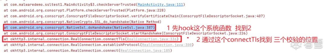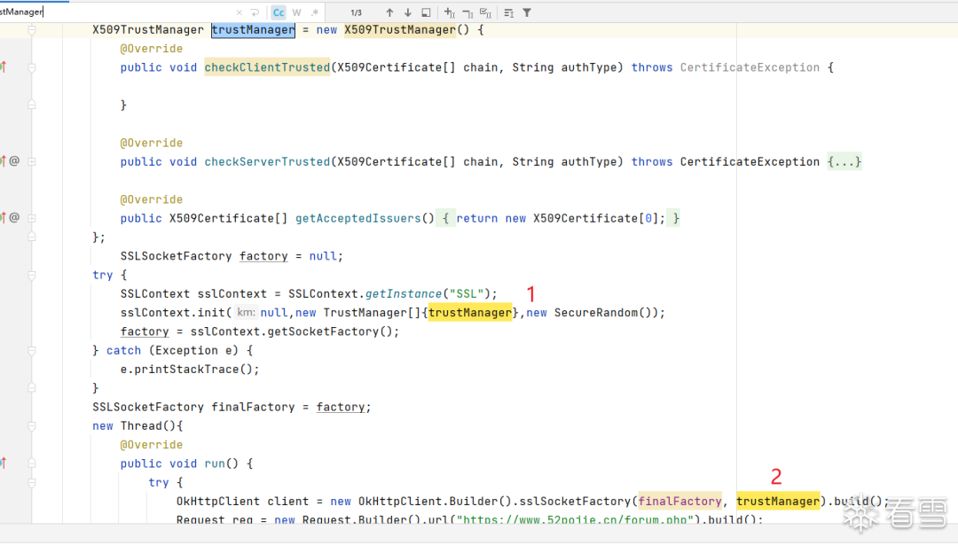 trustManager 类实现的checkServerTrusted接口。X509TrustManager trustManager = new X509TrustManager() {...@Overridepublic void checkServerTrusted(X509Certificate[] chain, String authType) {...}....}