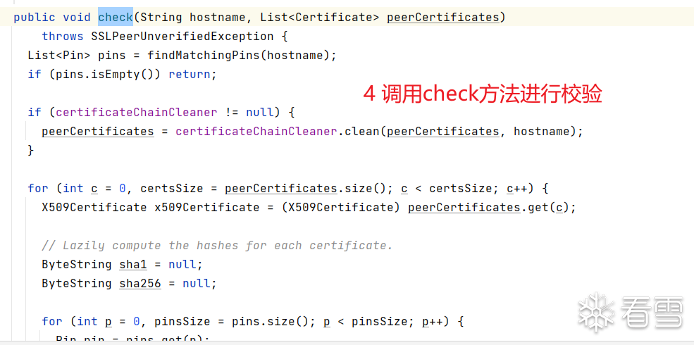 public void check(String hostname, List<Certificate> peerCertificates)throws SSLPeerUnverifiedException {List<Pin> pins = findMatchingPins(hostname);if (pins.isEmpty()) return;if (certificateChainCleaner != null) {peerCertificates = certificateChainCleaner.clean(peerCertificates, hostname);}for (int c = 0, certsSize = peerCertificates.size(); c < certsSize; c++) {X509Certificate x509Certificate = (X509Certificate) peerCertificates.get(c);// Lazily compute the hashes for each certificate.ByteString sha1 = null;ByteString sha256 = null;for (int p = 0, pinsSize = pins.size(); p < pinsSize; p++) {Pin pin = pins.get(p);if (pin.hashAlgorithm.equals("sha256/")) {if (sha256 == null) sha256 = sha256(x509Certificate);if (pin.hash.equals(sha256)) return; // Success!} else if (pin.hashAlgorithm.equals("sha1/")) {if (sha1 == null) sha1 = sha1(x509Certificate);if (pin.hash.equals(sha1)) return; // Success!} else {throw new AssertionError("unsupported hashAlgorithm: " + pin.hashAlgorithm);}}}