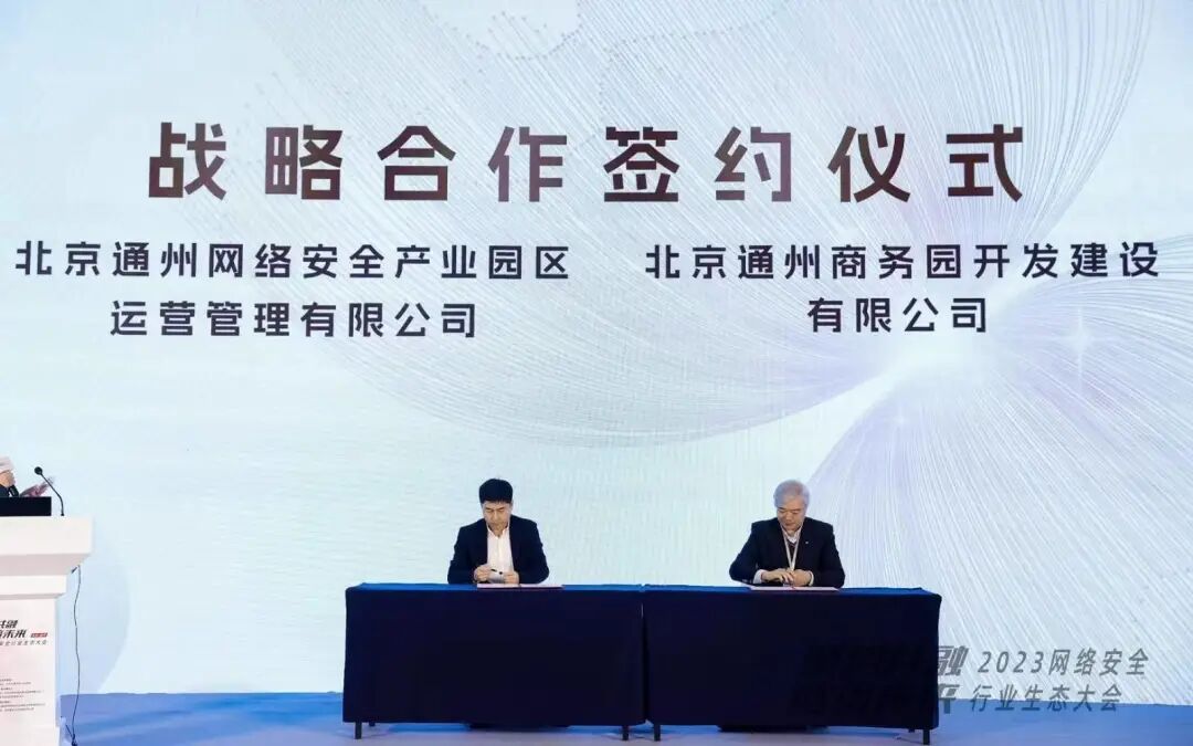 会上,北京通州网络安全产业园区运营管理有限公司董事长王健、北京通州商务园开发建设有限公司董事长王宏签署了战略合作协议。