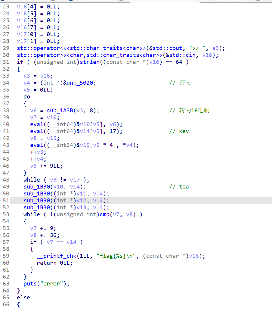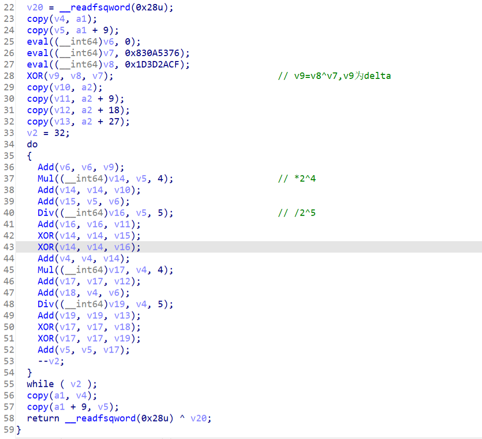 __int64 sub_140016230(){ char *v0; // rdi __int64 i; // rcx char v3[32]; // [rsp+0h] [rbp-20h] BYREF char v4; // [rsp+20h] [rbp+0h] BYREF int v5; // [rsp+24h] [rbp+4h] int v6; // [rsp+44h] [rbp+24h] int v7[12]; // [rsp+68h] [rbp+48h] BYREF _DWORD v8[16]; // [rsp+98h] [rbp+78h] BYREF int v9[31]; // [rsp+D8h] [rbp+B8h] BYREF int j; // [rsp+154h] [rbp+134h] int k; // [rsp+174h] [rbp+154h] int l; // [rsp+194h] [rbp+174h] v0 = &v4; for ( i = 102i64; i; --i ) { *(_DWORD *)v0 = -858993460; v0 += 4; } sub_14001137F(&unk_140023009); v5 = 32; v6 = 0; v7[0] = 1234; v7[1] = 5678; v7[2] = 9012; v7[3] = 3456; memset(v8, 0, 0x28ui64); v9[15] = 0; v9[23] = 0; sub_1400113E8(); for ( j = 0; j < 10; ++j ) sub_1400111FE("%x", &v8[j]); // 读入16进制数组v8 sub_140011339(v7); // v7 = [2233,4455,6677,8899] sub_140011145(v8, v9); // v8赋值给v9 sub_1400112B7(v8, v7); // xtea加密v8,v7为key v6 = sub_140011352(v8); // 判断v8是否等于[0x1A800BDA,0xF7A6219B,0x491811D8,0xF2013328,0x156C365B, //0x3C6EAAD8,0x84D4BF28,0xF11A7EE7,0x3313B252,0xDD9FE279] if ( v6 ) { sub_140011195("you are right\n"); for ( k = 0; k < 10; ++k ) { for ( l = 3; l >= 0; --l ) sub_140011195("%c", (unsigned __int8)((unsigned int)v9[k] >> (8 * l)));// 输出flag } } else { sub_140011195("fault!\nYou can go online and learn the tea algorithm!"); } sub_140011311(v3, &unk_14001AE90); return 0i64; }
