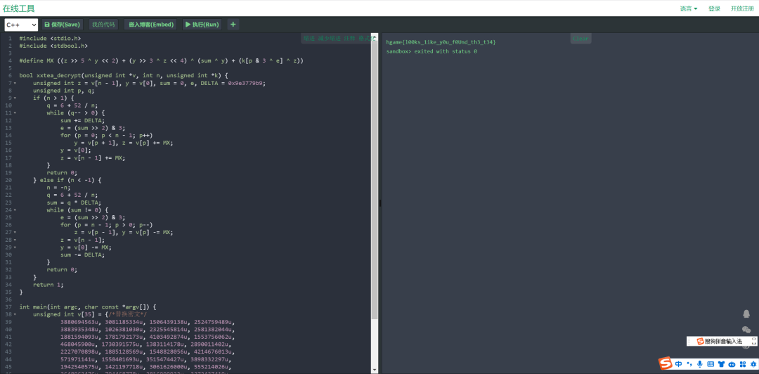 #include <stdio.h>#include <stdbool.h>#define MX ((z >> 5 ^ y << 2) + (y >> 3 ^ z << 4) ^ (sum ^ y) + (k[p & 3 ^ e] ^ z))bool xxtea_decrypt(unsigned int *v, int n, unsigned int *k) {unsigned int z = v[n - 1], y = v[0], sum = 0, e, DELTA = 0x9e3779b9;unsigned int p, q;if (n > 1) {q = 6 + 52 / n;while (q-- > 0) {sum += DELTA;e = (sum >> 2) & 3;for (p = 0; p < n - 1; p++)y = v[p + 1], z = v[p] += MX;y = v[0];z = v[n - 1] += MX;}return 0;} else if (n < -1) {n = -n;q = 6 + 52 / n;sum = q * DELTA;while (sum != 0) {e = (sum >> 2) & 3;for (p = n - 1; p > 0; p--)z = v[p - 1], y = v[p] -= MX;z = v[n - 1];y = v[0] -= MX;sum -= DELTA;}return 0;}return 1;}int main(int argc, char const *argv[]) {unsigned int v[35] = {/*替换密文*/3880694563u, 3081185334u, 1506439138u, 2524759489u,3883935348u, 1026381030u, 2325545814u, 2581382044u,1881594093u, 1781792173u, 4103492874u, 1553756062u,468045900u, 1730391575u, 1383114178u, 2890011402u,2227070898u, 1885128569u, 1548828056u, 4214676013u,571971141u, 1558401693u, 3515474427u, 3898332297u,1942540575u, 1421197718u, 3061626000u, 555214026u,2648963476u, 794468778u, 2816999933u, 3272437419u,464379036u, 877899850u, 2460223225u};unsigned int key[4] = {1, 2, 3, 4};/*替换密钥*/xxtea_decrypt(v, -35, key);for (int i = 0; i < 35; i++)printf("%c", v[i]);}