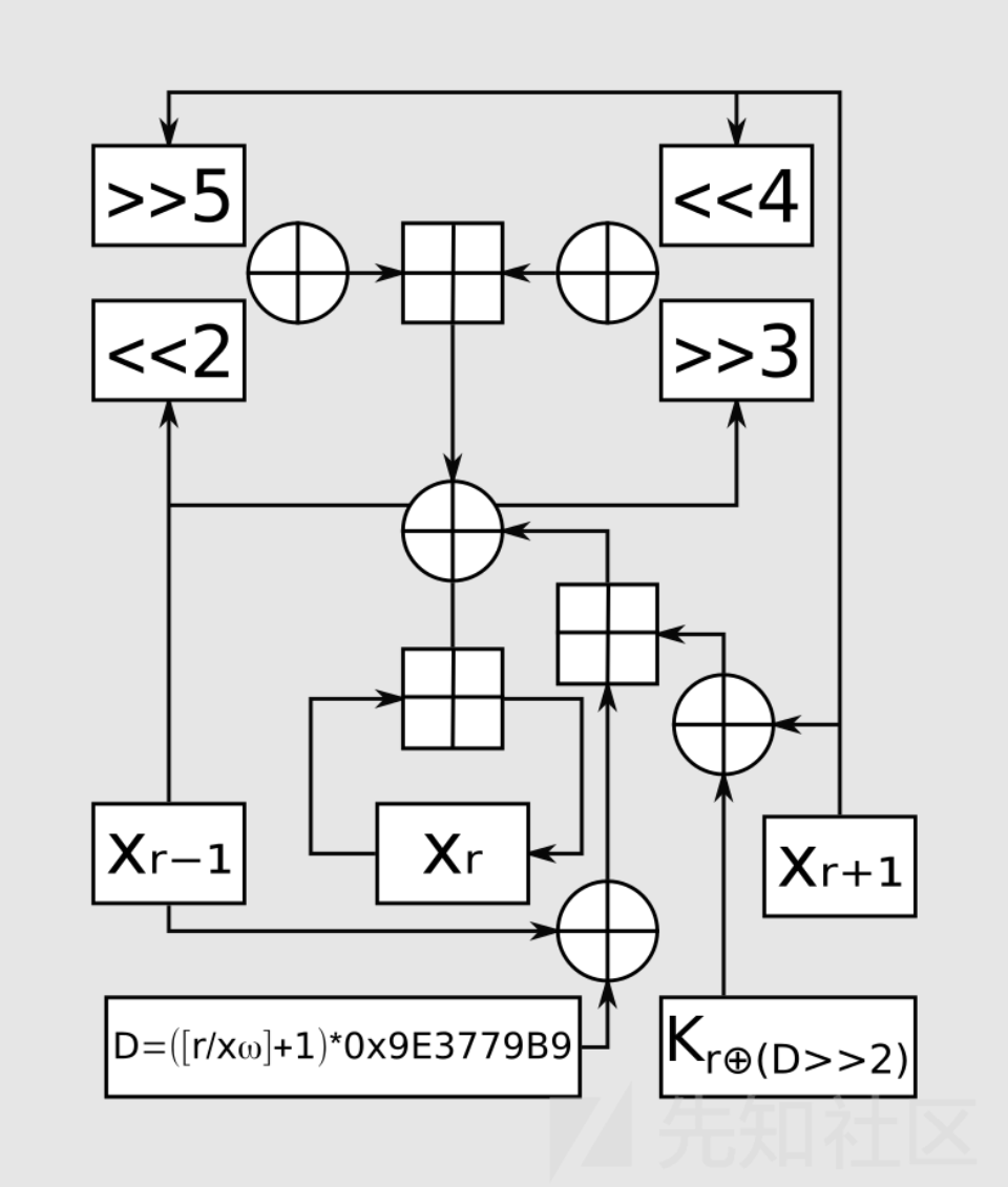 xxTea的主加密部分>>5,<<2,>>3,<<4,xor,循环次数为6+52/n,enc长度大于64