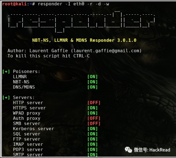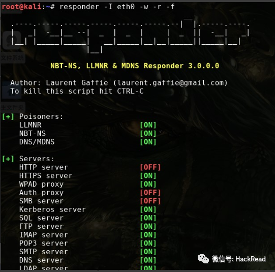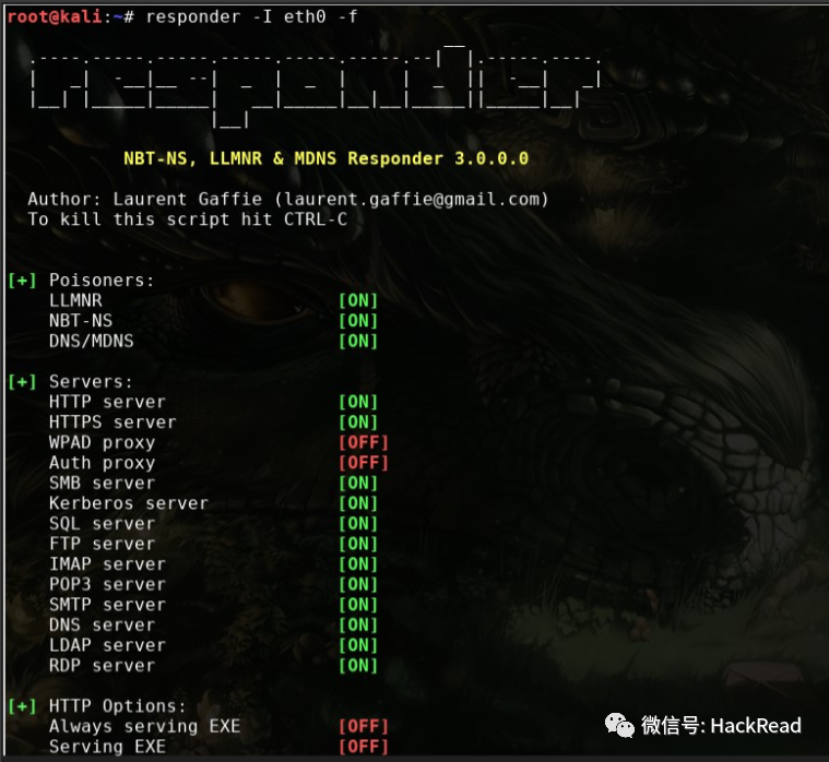 Step 1:在攻击者主机中使用responder(https://github.com/lgandx/Responder)执行如下命令开启监听: