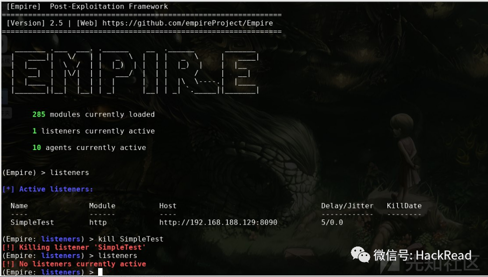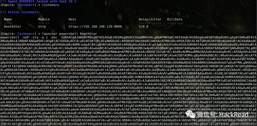 Step 3:在empire中生成powershell,此时你会发现多了一个名为DeathStar的listener,之后我们使用该listener来生成powershell代码: