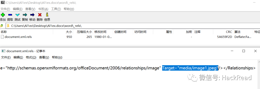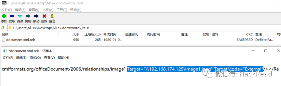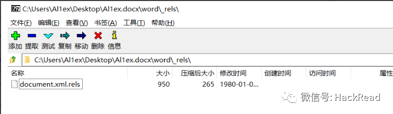 然后用7zip打开(没测试其他软件,可自行测试),之后进入word_rels,修改document.xml.rels