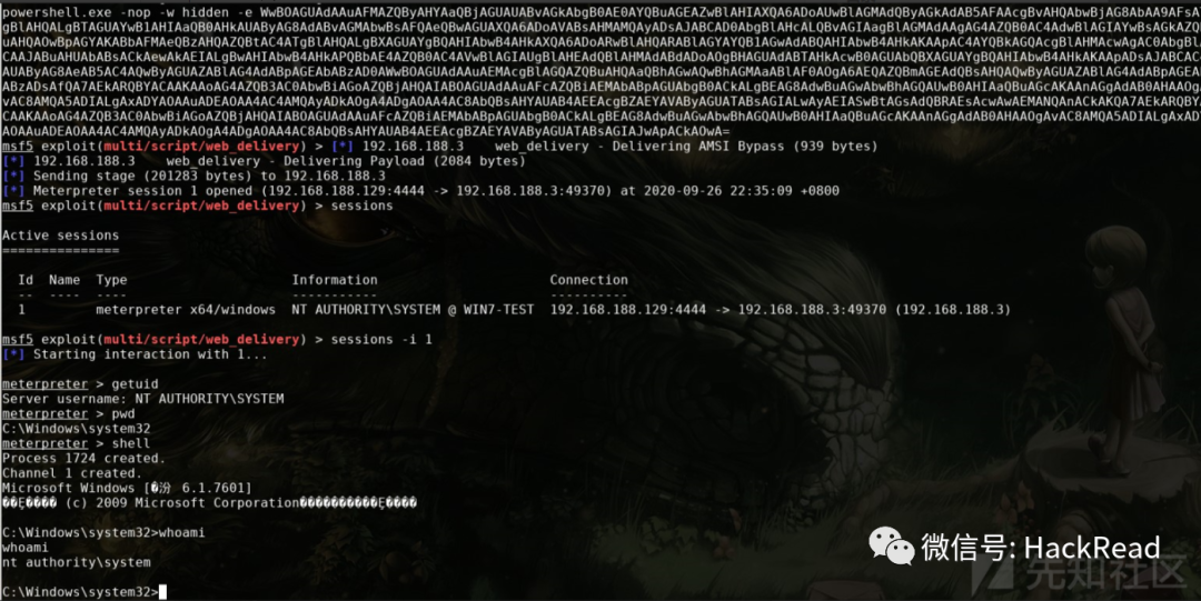 1 meterpreter x86/windows NT AUTHORITY\SYSTEM @ X-90E984B4C76D4 192.168.188.136:4444 -> 192.168.138.188:1034 (192.168.188.128)